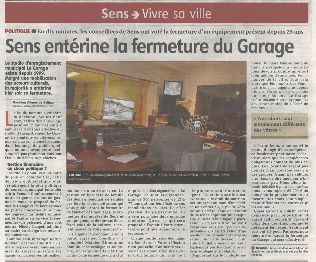 Lors du dernier Conseil municipal, la fermeture du studio d’enregistrement « Le Garage » après 25 ans d’activité a soulevé une vive controverse, marquant un tournant dans la politique culturelle de la ville de Sens. Ce lieu emblématique, qui a vu passer des générations d’artistes locaux et joué un rôle essentiel dans l’éveil musical des jeunes, laisse un vide certain pour nombre de Sénonais.