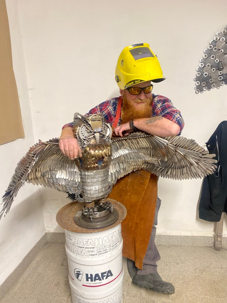L’acier est son médium, mais aussi son miroir. Dur à l’extérieur, malléable à l’intérieur, il reflète parfaitement le caractère de « Yo ». Sous ses airs de « bûcheron », se cache un véritable nounours : humble, affectueux et profondément généreux. Cette générosité se retrouve dans ses créations, comme ce hibou majestueux, fruit de 876 manches de cuillères et 540 dos de cuillères savamment soudés. Yoann travaille à l’instinct, rarement avec des croquis, laissant son imagination libre d’imposer sa forme à l’acier.