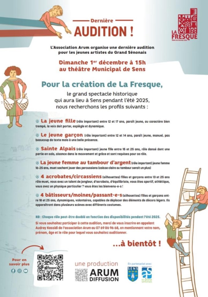 Pour compléter son équipe et faire vivre cette fresque historique, l’association Arum recherche encore quelques personnes motivées pour rejoindre la troupe. Que vous soyez un amateur d’histoire, un comédien en herbe, ou simplement intéressé par cette aventure collective, La Fresque vous invite à incarner un personnage de l’histoire de Sens. Tous les profils sont les bienvenus, qu’il s’agisse de rôles principaux ou de figurants, offrant ainsi une opportunité unique de participer à un projet culturel d’ampleur.